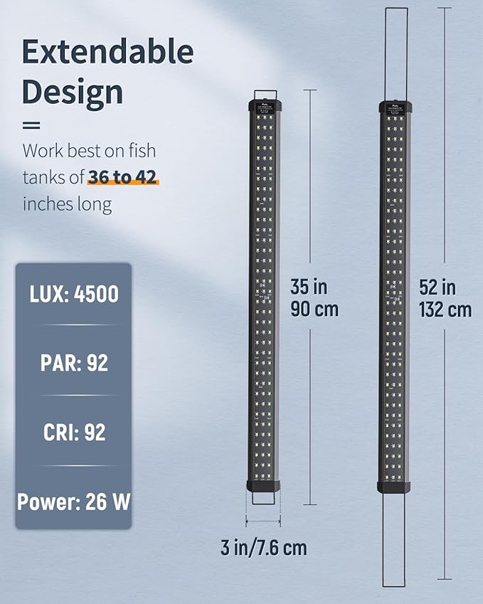 - For 36" to 42" Tanks: With an extendable bracket (min length: up to 36"; max length: up to 42"), the LED aquarium light always stays steady on the fish tank. Work best on tanks of 36 to 42 inches long.