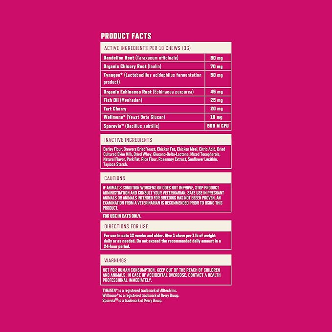 - Better Ingredients, Better Results: Each chew is packed with three key ingredients— a probiotic, tart cherry, and fish oil; Tart cherry provides antioxidants to support the immune system, while our probiotic targets your cat’s gut health and work to support your cat’s natural ability to respond to allergens; We also include fish oil from menhaden, a small fish with high levels of EPA and DHA to help promote normal skin moisture content