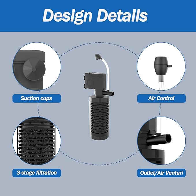 - AERATION - The fish tank filter comes with accessories to increase oxygen supply. It's important to note that for optimal aeration, this fish filter should not be positioned too deep in the water and the air regulator should be positioned higher than the water level.