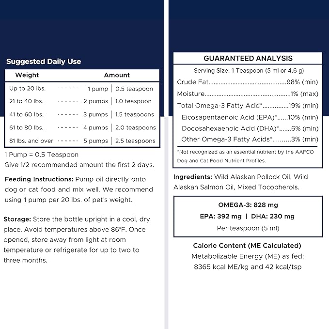 - Our Wild Alaskan Fish Oil dog food supplement comes with 64 oz. of salmon and pollock oil. There is also an optional pump cap for easy measuring and distribution. Made in USA.