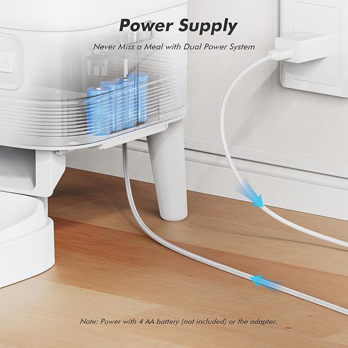- Dual Power Supply: Powered by either a Type-C adapter or 4 AA batteries (not included), this automatic feeder keeps meals coming even during power outages—so your pet never goes hungry. It also includes a durable, chew-resistant 1.5-meter nylon cable for flexible and worry-free placement