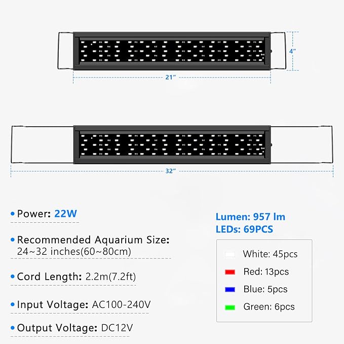 - High Quality Fish Tank Light: 5 rows of high brightness LED light beads, high transmittance, straight to the bottom of the water; White, red, green and blue light beads scientific combination very suitable for plant growth; Good heat dissipation of the ABS shell; Retractable metal stand can be adjusted within a certain range to best fit the fish tank distance