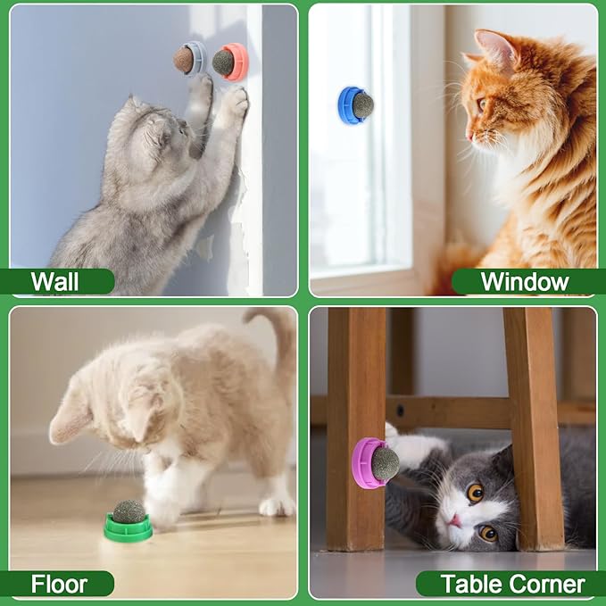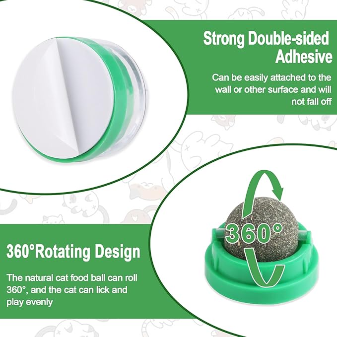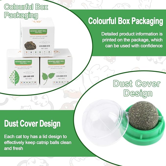 - Practical Design: Colourful box packaging with detailed product information,which can be used with confidence.Dust cover design can keep catnip balls clean and fresh.Strong double-sided adhesive make these catnip balls can be easily attached to the wall or other surface and will not fall off.The catnip ball can be rotated 360° when it is licked.