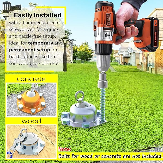 - EASY TO INSTALL AND USE: You can use a cordless drill or impact spanner to install/remove our dog stakes in just a few seconds. You can also use a hammer to hammer stainless steel screws into hard surfaces or wooden boards to secure the swivel base.
