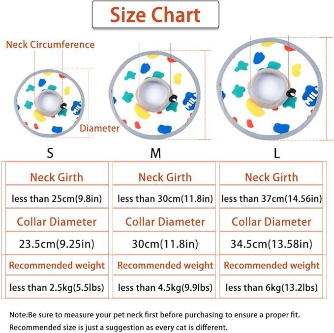 - Size:S,Neck Circumference:less than 9.8in, Recommended weight:less than 5.5lbs, Collar Diameter:9.25in, M,Neck Circumference: less than 11.8in, Recommended weight: less than 9.9lbs, Collar Diameter:11.8in, L,Neck Circumference:less than 14.56in, Recommended weight:less than 13.2lbs, Collar Diameter:13.58in