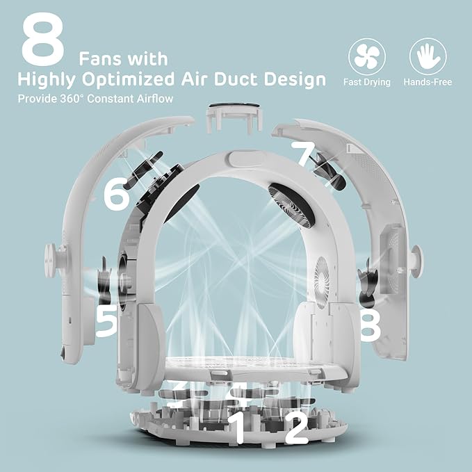 - 8 Fans, Fast Drying - Experience speedy drying for your pets with our advanced 360° airflow circulation system that evenly covers your pet's entire body, including those tricky-to-reach spots like the belly, toes, and armpits. With this thoughtful feature, you can keep your hands free while ensuring every inch of your pet is effectively dried. The system has 8 High-velocity fans on the bottom, sides, and top, which work together to ensure adequate drying.