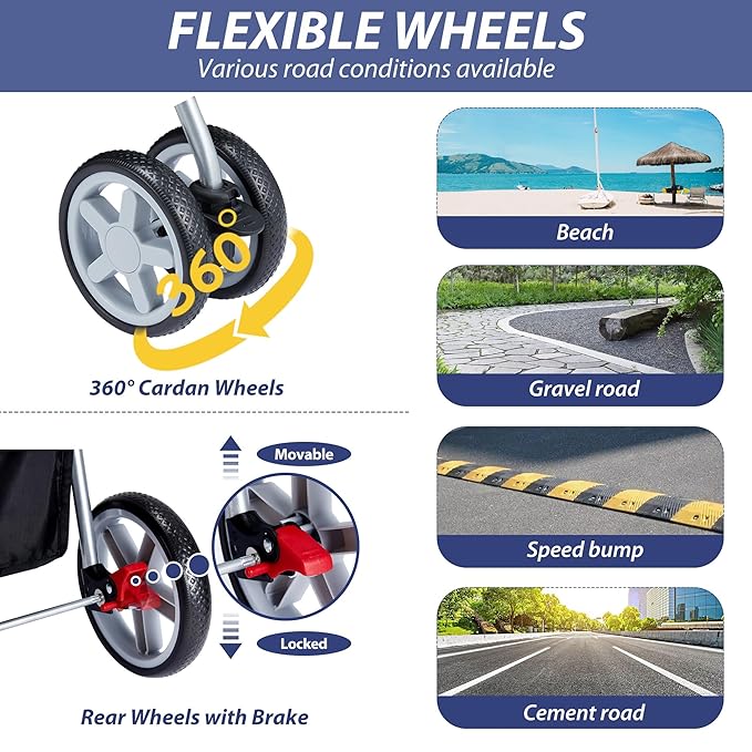 - 【360° Cardan Wheels with Brake】The dog stroller has two 360° universal front wheels, which can easily pass through sand, gravel roads, and speed bump. And cat carrier comes with 2 rear brakes to ensure smooth locking and is suitable for small, medium or elderly dogs and cats.(PS: The front wheels are locked down to keep driving straight.)