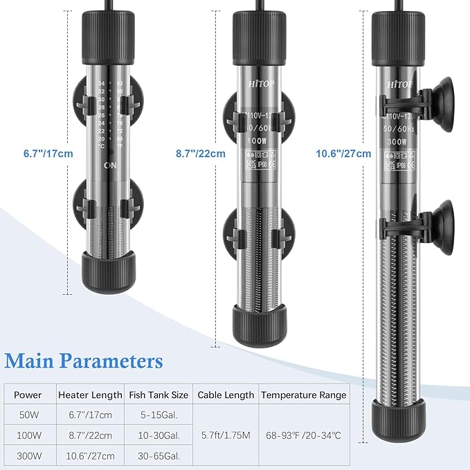 - [Complete Accessories] After you get the package, you will receive HITOP 300W aquarium heater with 5.7FT power cable and external controller, 3 suction cups to fix the heater, 1 thermometer strip to check water temperature,1 bottom protective cover to protect the heater and your lovely fish. We provide 12 months after-sales service for all our products.