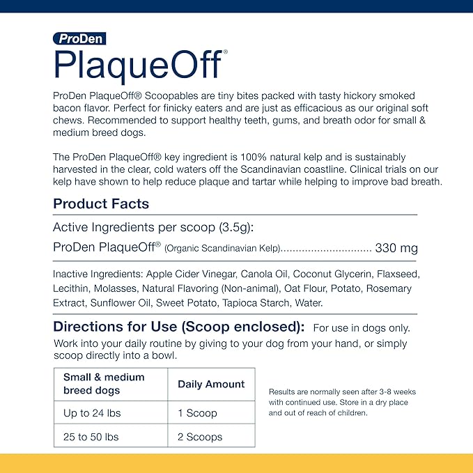 - Easy to Administer - ProDen PlaqueOff Scoopables are simple to add to your dog's diet, making daily dental care effortless for pet owners and enjoyable for dogs.