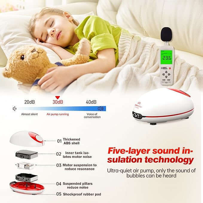 - Are you looking for a quiet aquarium air pump? Our product is your ideal choice. Compared with other air pumps on the market, it has excellent silent performance, produces almost no noise, and creates a quiet environment. It is suitable for placement in the bedroom, living room or office, and will not interfere with your life and work.
