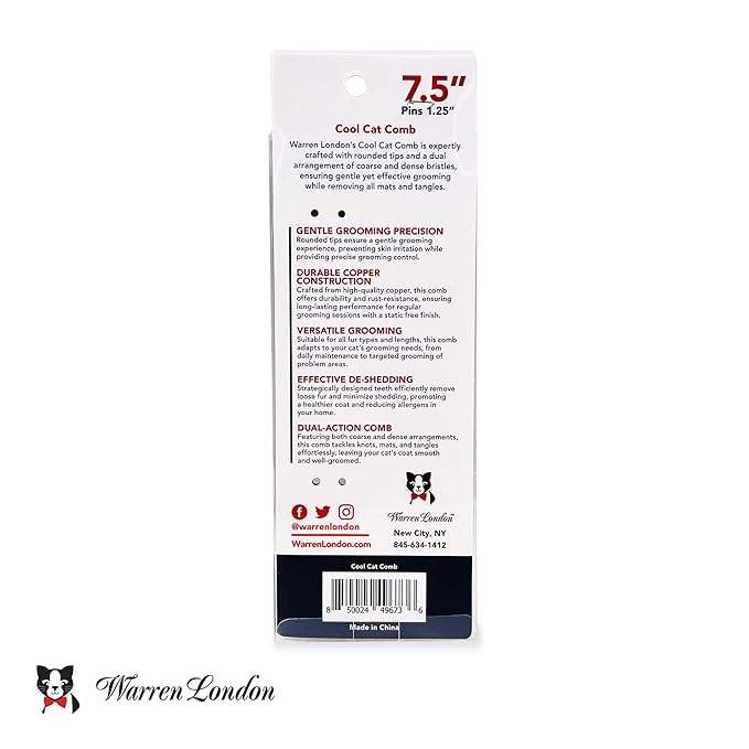 Warren London Cool Cat Comb | 7.5 inches of Copper Strength | Rounded Tips Comfort Durability | Fine/Coarse Greyhound Style Deshedding Dematting