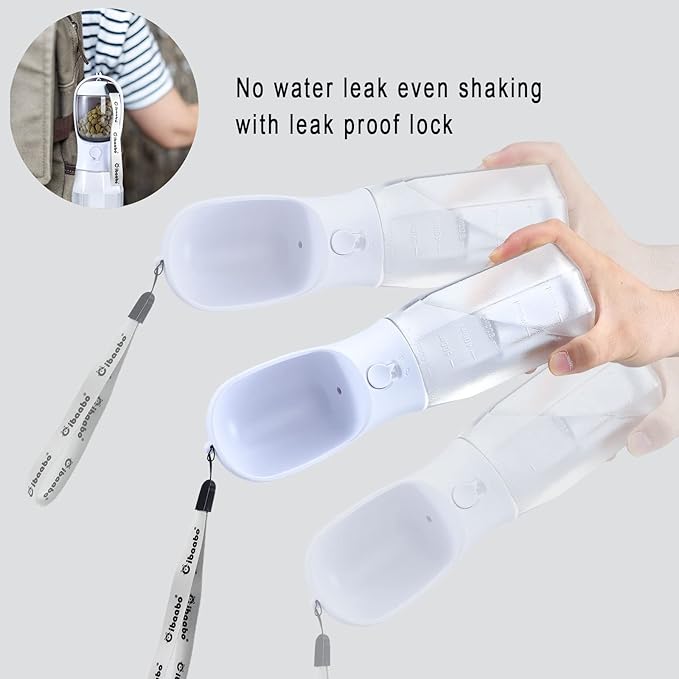 - Dog Water Bottle & Treat Container: Compare with the common dog water bottle, there is a 100g food container closely attach to the bowl of water bottle. It provides both clean water and fresh food when you go out with your pets