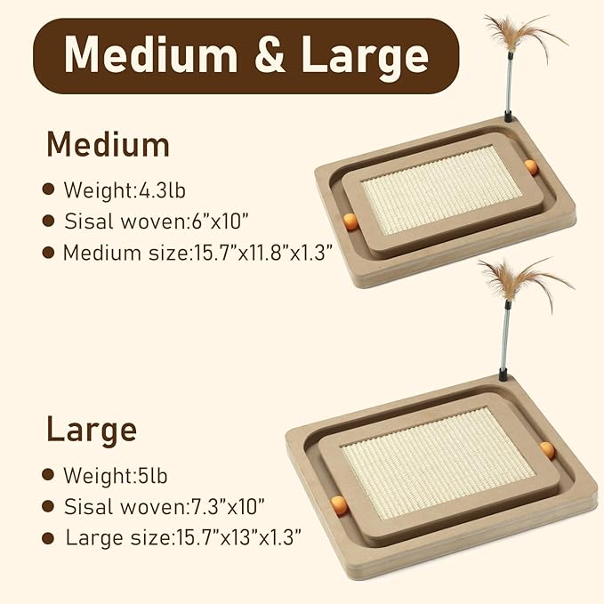 - Large Size:Scratcher toys size:15.7*11.8*1.4inches.Weighs 4.3 pounds.Perfect for cats of all sizes to scratch and play.Please put it in a place where the cat is usually active.