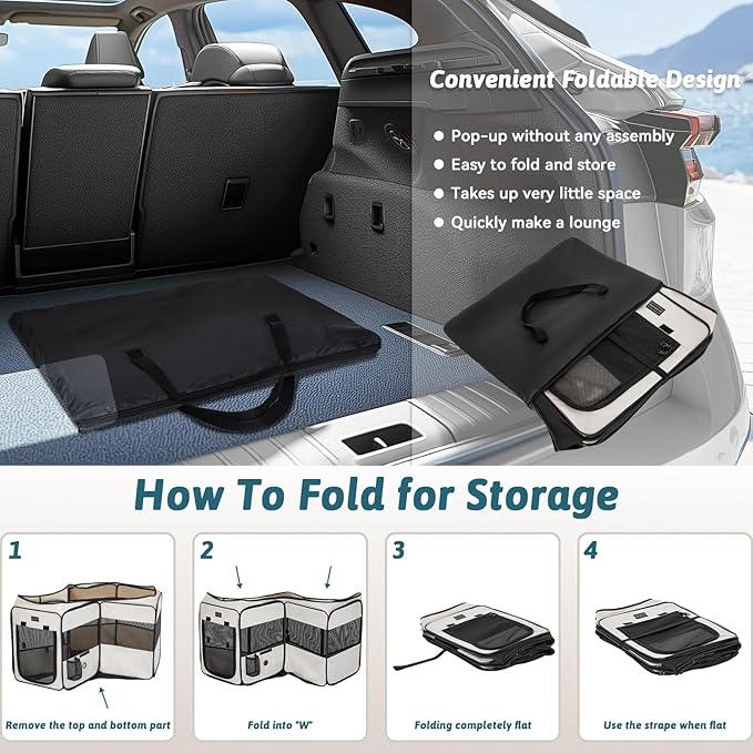 - 3-Second Setup & Travel-Ready:This lightweight dog playpen comes with a carrying bag for easy transport, sets up quickly and folds flat, includes two pockets and a water bottle holder, ideal for travel and camping with no assembly required