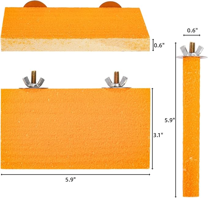 - The package comes in 8 pcs parakeet toys, including 4 pcs paw grinding sticks and 4 pcs bird perch stand platform. The sticks measure 5.9”x0.6” and the boards are 5.9”x3.1”. There are 4 beautiful colors, green, orange, pink, and blue, perfect to decorate your bird's cage.