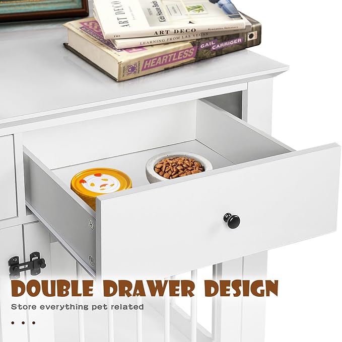 - Large Table Top & Storage Drawer: The top panel of the dog cage is large and sturdy, and can hold up to 150 lbs, perfect for displaying home decorations such as plants, magazines, and family photo frames. And below the countertop are two large drawers, you can store dog food, snacks, toys, etc. Under the drawers is the exclusive space for the dog