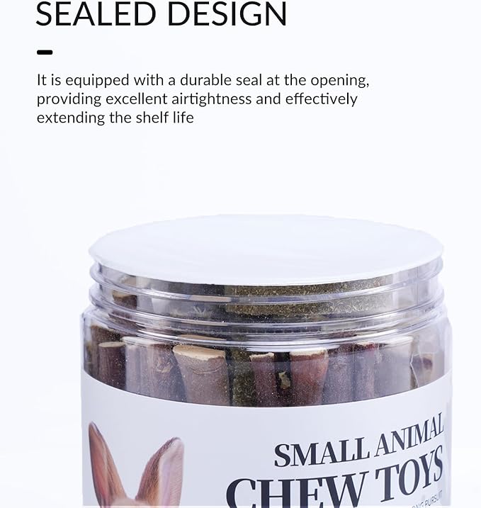 - 【Sealed Design for Rabbit Chew Toys for Teeth】The jar containing this rabbit chew toys is equipped with a durable seal at the opening, providing excellent airtightness and effectively extending the shelf life of the toys. The jar and lid are precisely threaded to ensure a tight seal when the lid is screwed on, preventing air and moisture from entering even when the toys are not in use. This also helps to extend the shelf life of the guinea pig chew toys for teeth.