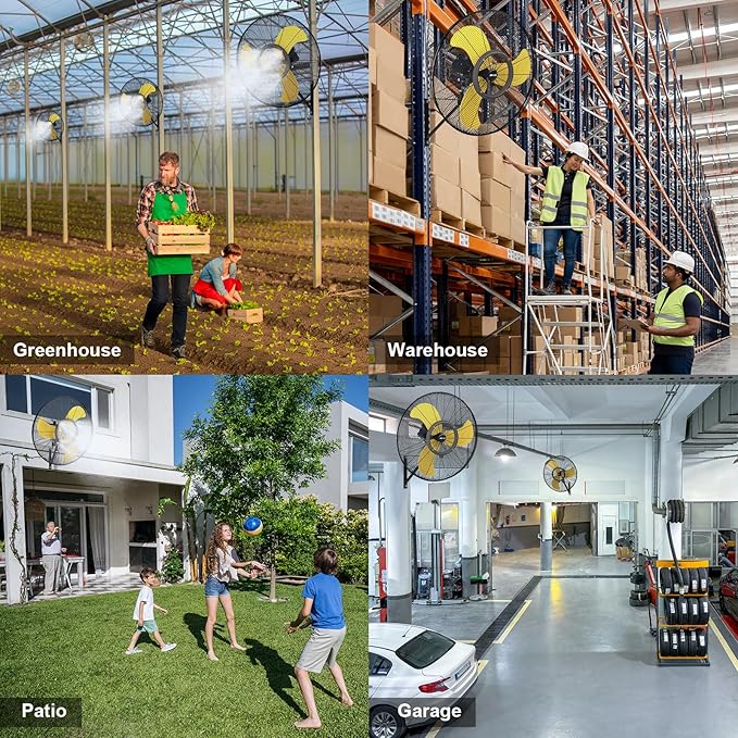 - Waterproof Outdoor Fan: UL listed, outdoor grade. Designed with sealed and enclosed motor, IP44 waterproof, GFCI plug, and thermal overload protection,ideal for high humidity, dust, debris even raining conditions like warehouse, industrial, barn, and greenhouse. This is an industrial wall mounted fan, the noise is louder than home fans, but less noisy than most of the same size industrial fans