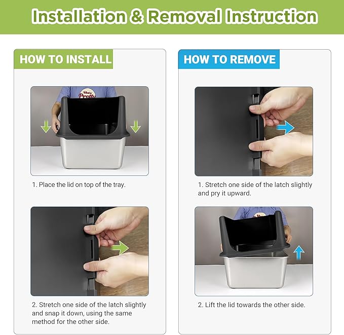- Buckle Design: The stainless steel cat litter box with lid are tightly connected to the high wall through a buckle, making it easy to install and stable to connect without worrying about the shell falling off.