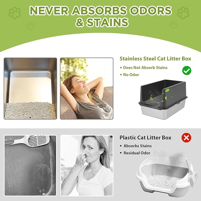 - Easy to Clean: Easy to clean litter box for large cats , without any stains, corrosion, or rust marks, and no residual odor. Create a clean and tidy environment for you and your cat.