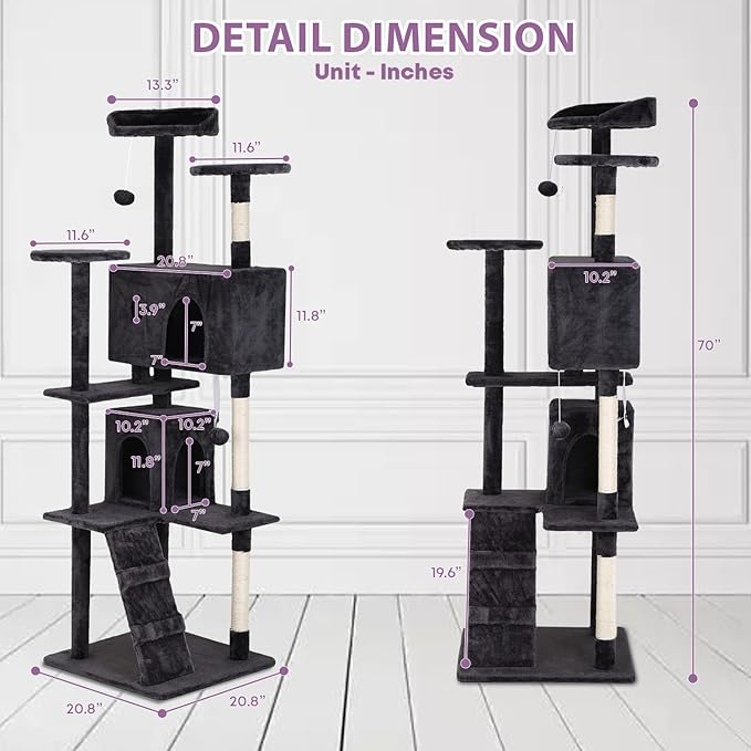 70 inches Cat Tower for Indoor Cats Multi-Level Cat Condos for XL Cat Tree Cat Climbing Tower with Scratching Posts, Hanging Toys,Dark Gray