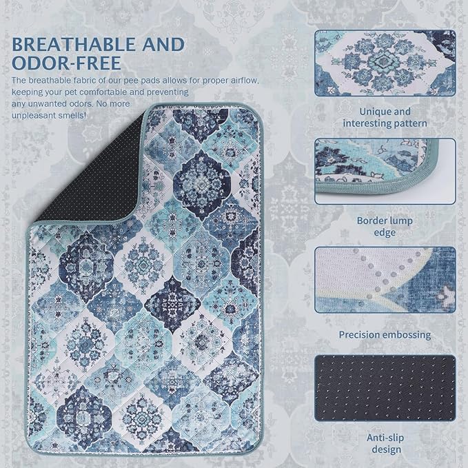 - 【Fashionable and Non-Slip】Our bohemian-print design adds a natural touch to the potty pads for dogs, giving your room a warm, casual vibe. And the non-slip bottom design makes the pet pee pads can achieve a certain fixed effect, you can put it anywhere you want. Soft and non-slip material makes it safer for dogs to use the pads.