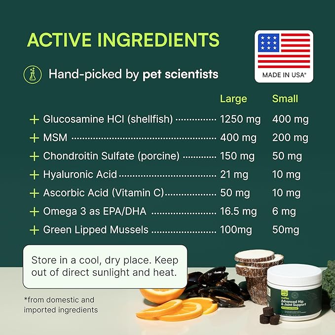 - Joint Support for Large Breeds: Our chewable supplement is specially formulated with a higher concentration of active ingredients to support the unique joint needs of large and giant breed dogs, helping maintain healthy joint function and comfortable mobility as they grow and age.