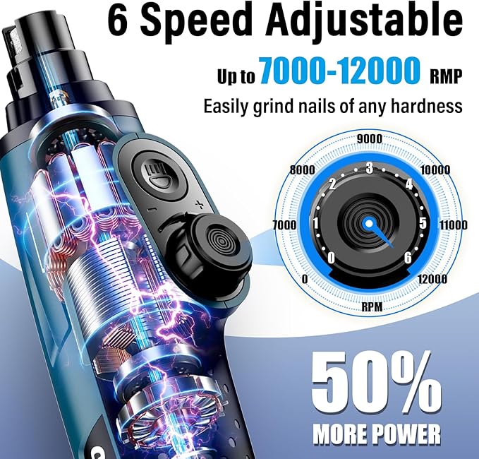 - 【Adjustable 6 Speeds for Perfect Precision】 With speeds from 7000 to 12000 RPM, the Casfuy electric dog nail file is one of the most powerful on the market. It offers 6 speed levels, each featuring 9 variable power settings. The smart optimization ensures that every speed delivers the ideal power for small, medium, and large pets’ nail care. Experience the perfect blend of power and precision.