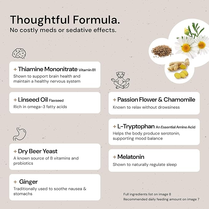 - Thoughtful Formula: With Passion Flower & Chamomile known for relaxation, Vitamin B1 for irritability, Amino Acids for mood, & Melatonin for dogs known for sleep, our dog calming treats are made with ingredients shown to bring comfort without sedation