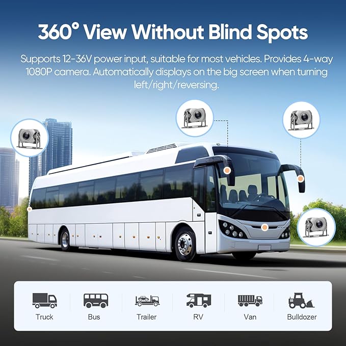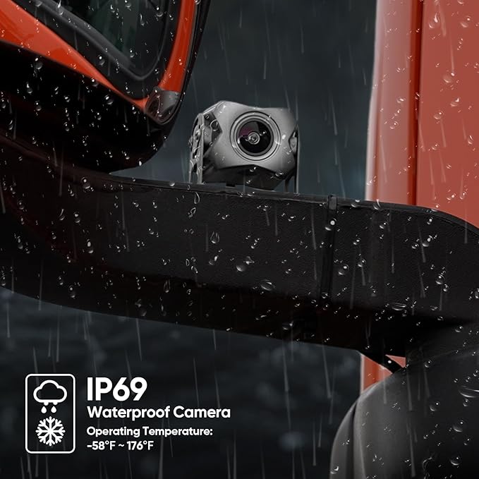 - 4 IP69 rated waterproof metal cameras: With a wired connection, the signal transmission is more stable and the picture quality is clearer.Equipped with a special bracket, you can freely adjust the shooting angle,The camera of backup camera system is constructed with aluminum alloy housing, IP69 level waterproof, high temperature resistant, cold resistant, and can work stably in extreme weather such as rain and snow.