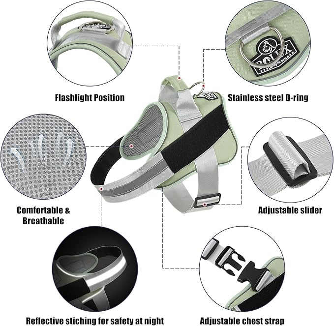 - SUPER COMFORTABLE: Bolux no choke dog harness pulling pressure is evenly distributed to the body to prevent pulling and choking. The dog vest harness have a adjustable chest strap with snap on buckle, move its body parts freely, can customized fits for your puppy growth do not need to always change it.