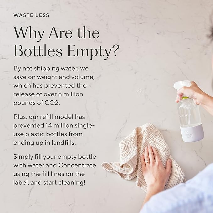 - SIMPLE, SUSTAINABLE CLEANING: Our refillable bottle system reduces Glass waste and lowers CO2 emissions, helping you contribute to a healthier planet without compromising on performance. By switching to this kit, you can eliminate dozens of single-use Glass bottles each year, supporting a sustainable cleaning routine that delivers sparkling clean results.