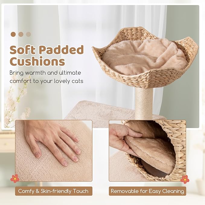 - [Hand-Woven Natural Cattail Material]: The perch and condo of this cat tree tower are meticulously crafted from breathable natural cattail, keeping your cat cozy and cool during long hours of rest. Moreover, it is also sturdy and high-strength for long-lasting durability.