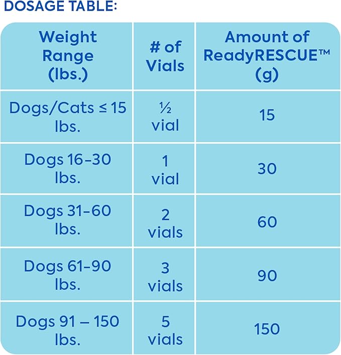 - EASY EMERGENCY SOLUTION: Worried about your curious puppy eating something dangerous? ReadyRESCUE is a breeze to use! Mix it with pet food, water, or a tasty treat like peanut butter. Quick, easy, and stress-free detox for you when every second counts! This single use vial is recommended for pets 30 lbs and under.