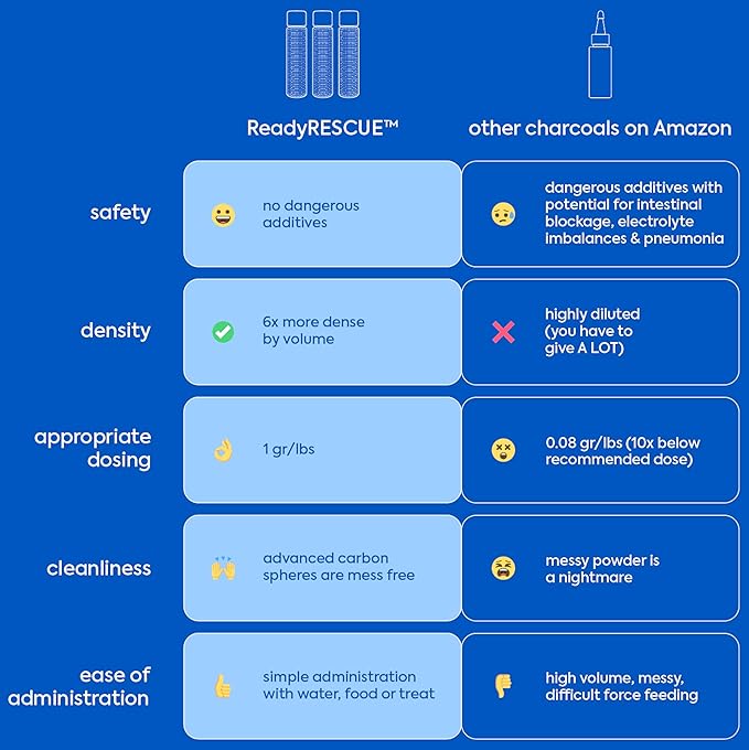 - SAFE AND RELIABLE: Worry less about accidental overdoses or false alarms. ReadyRESCUE is completely safe, even if poisoning isn't confirmed. It passes harmlessly through the GI tract absorbing potential poisons along the way, ensuring your pet's safety every time.
