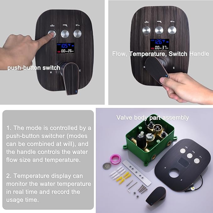 - Temperature digital display(no power or battery required): rain shower system design update, shower valve uses a hydro generator, built-in LCD digital temperature display(°F), easy to monitor temperature