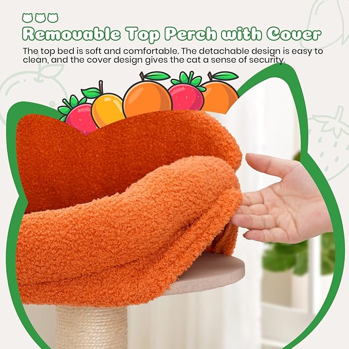- Playful Fruit-Themed Design – Add a splash of color and fun to your home with this vibrant, fruit-inspired cat tree that blends functionality with a whimsical touch.