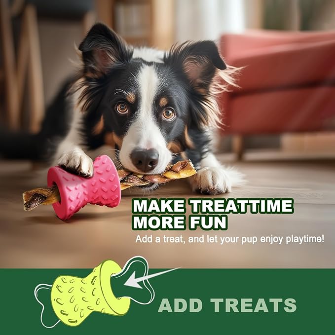 - 【DURABLE DOG CHEW TOY】 Our Interactive Dog Toys for Treat Dispensing provide safe, clean, and long-lasting fun for your dog. More durable, healthy and puncture resistant compared with PVC and TPR, also safe for your dog grinding and fresh their teeth. Great for Dog Teeth Cleaning and Chew Toys, meanwhile treat dispensing dog toys to keep them busy,dog puzzles for smart dogs. puppy essentials