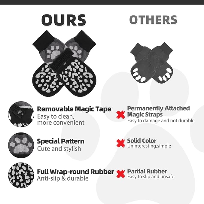 - DOUBLE SIDED NON-SLIP: Each side of the sock has the grip, which provides additional traction when your dog walks on a smooth floor. Even if the socks are twisted, they can still work. In addition, the design of the double-sided grip ensures a longer lifespan of the socks. When the grip on one side is worn and has no anti slip effect, it can cause the dog to wear on the other side, exerting a new anti slip effect.