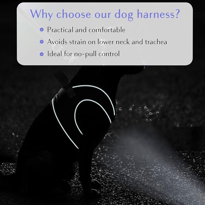 - Safe and Comfortable - Your dog will enjoy the daily walk in this comfort dog harness! Made of sturdy fabric oxford and padded with soft cushion to protect your dog's skin. Breathable cloth keeps your dog cool during outdoor activities. Super bright strips ensure a safe walk both day and night