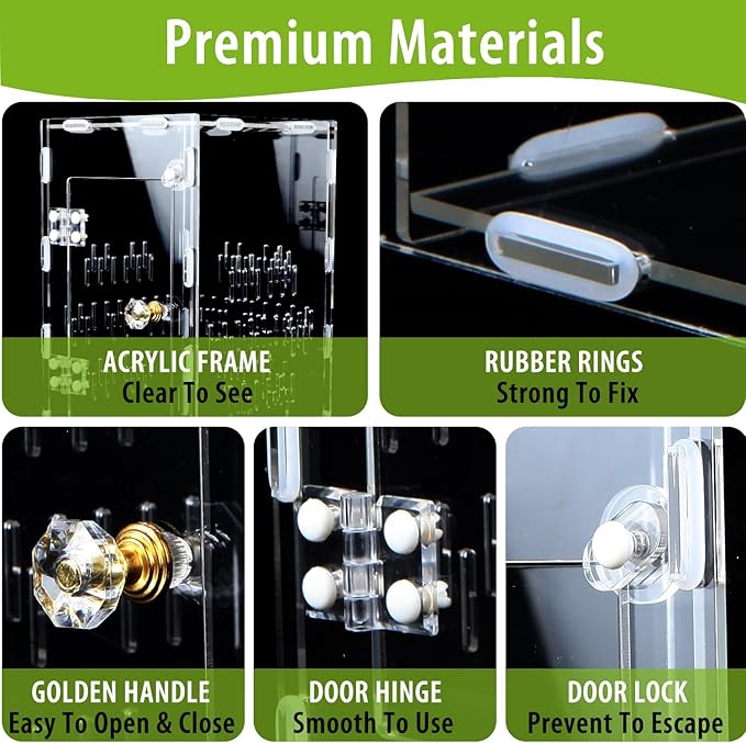 - 【 Premium Material 】This spider enclosure is crafted from high-quality acrylic plastic, reliable and sturdy to service for long time.High elasticity rubber rings can seal the whole cage well, and the double insurance of two locks on the upper and lower of the door prevent pets from escaping