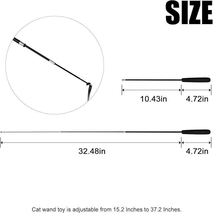 - 【Fishing Pole Toy Design】 This cat fishing rod toy is very light, flexible, durable and easy to store. cat wand toy is adjustable from 15.2 Inches to 37.2 Inches, with 20 Inches string, which can cover a large space for playing, it can really get your cats exercise.