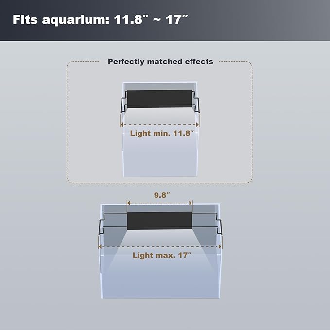 - 【Day/Night Mode】 The Day Mode consisting of white light, red light, and blue light provides bright and colorful lighting for your fish tank, resulting in excellent viewing effects. With 7 brightness adjustments (1%, 10%, 20%, 40%, 60%, 80%, 100%) and stepless dimming (1%-100%) ;The Night Mode (Blue Light) creates a soft and realistic moonlight atmosphere for your underwater world.