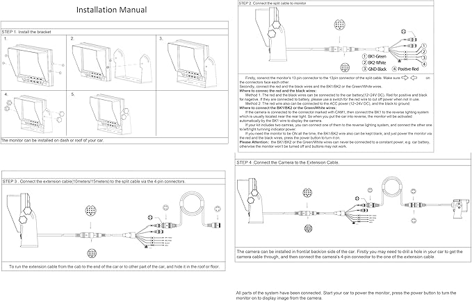 - 【Unique Selling Proposition】①Monitor has 2 trigger wires. Monitor will be triggered to be turned on automatically to display camera image when reversing. After reversing, the monitor will be back to the pervious mode. ②This system has two viewing options(view when reverse or remain on continuously). ③We uses waterproof Aviation 4-pin screw connectors, NO BNC/RCA. ④Easy to install. ⑤Two-year warranty and life-time tech support.
