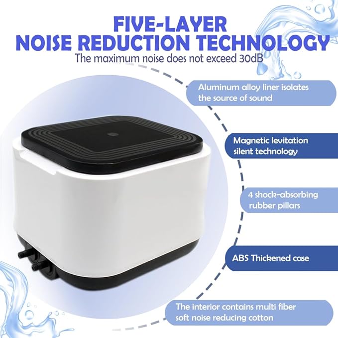- [Double Air Outlets, Powerful Performance]: 10w power can achieve a displacement of 260GPH, low power consumption makes it more energy-efficient, and the output airflow is naturally uniform and stable. It allows you to inflate multiple water tanks at the same time, with a pressure of 0.03Mpa, and can reach a water depth of 6.5 feet. It is suitable for quiet indoor environments and can be used with equipment such as sponge filters and nano bubble stones