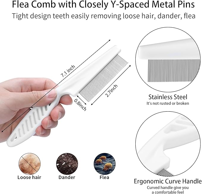 - Complete 5 PCS Grooming Kit: This set has all you need for grooming. The stainless steel comb detangles, the flea comb removes fleas and eggs, the rubber bath brush massages and cleans, and the undercoat rake removes mats and loose fur, keeping your pet’s coat healthy and shiny.
