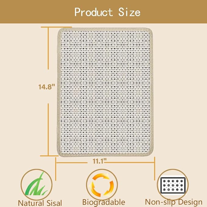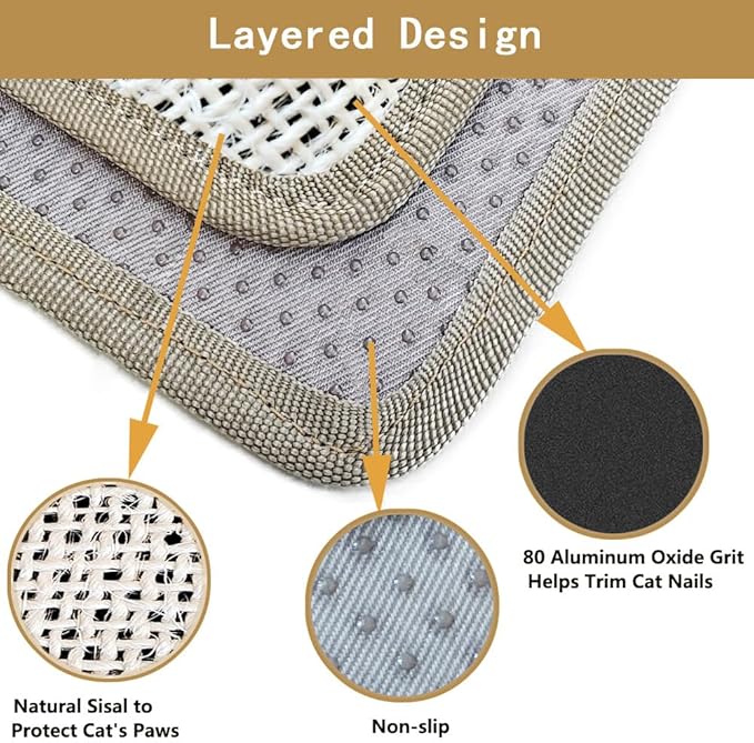 - LAYER DESIGN:The outer layer of this netted cat scratching mat is made of natural sisal plant leaves, a material most cats love to scratch, which protects the paws against the sandpaper below, the inner layer has 80-gauge aluminum oxide grit, which is effective in helping cats trim their nails, and the back of the cat nail file scratcher has small, non-slip particles that prevent the mat from sliding up and down.