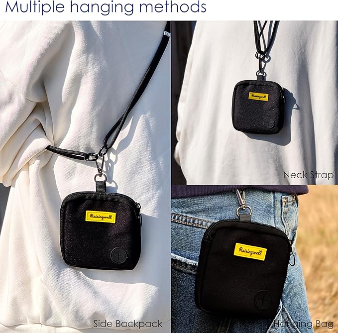 - Raisingwell Dog T1、Fashion Design: This dog training treat bag measures 4.9 x 5.1 inches and offers versatile wearing options. It comes equipped with a carabiner and a strap, allowing you to hang it on your leash, attach it to your pet's collar, or even wear it as a trendy accessory on your bag. The bag features a zipper closure, ensuring that treats stay secure inside even when you're playing with your pet afterward. It's perfect for carrying around or using during short outings.reat Pouch