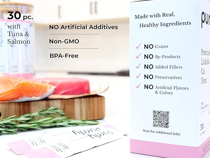 Purrly Squeezable Cat Treats Wet Healthy Interactive Hydrating Human-Grade Tuna & Salmon with Omega-3 & 6 for Skin & Coat (30 Count) Lickable Healthy Creamy Puree