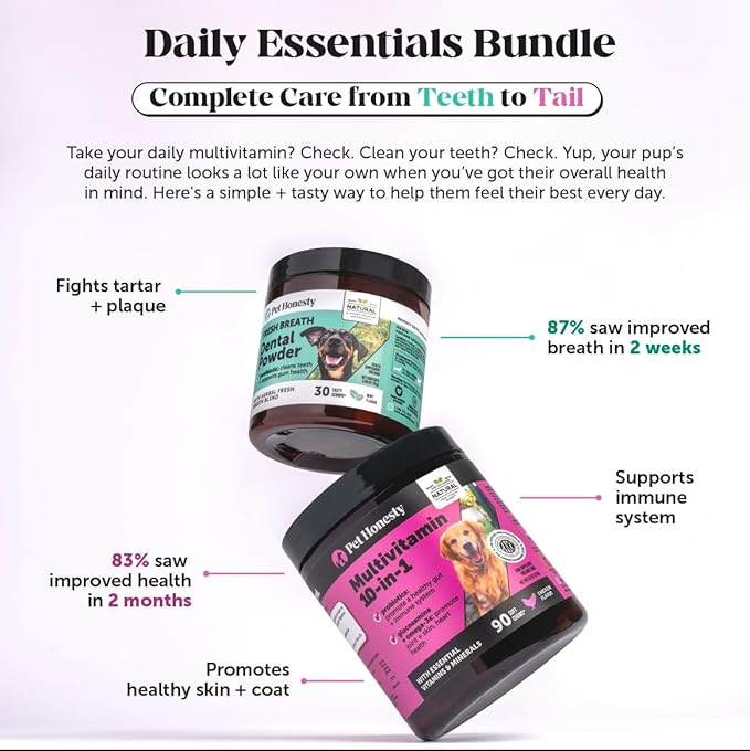 - Easy Dog Teeth Cleaning & Breath Freshener: Simplify dental care with Pet Honesty's dog dental powder. This blend of natural ingredients fights bad breath and supports healthy teeth and gums. No need to rely solely on brushing—just add this tasty powder to your pup’s food for effortless dental support.